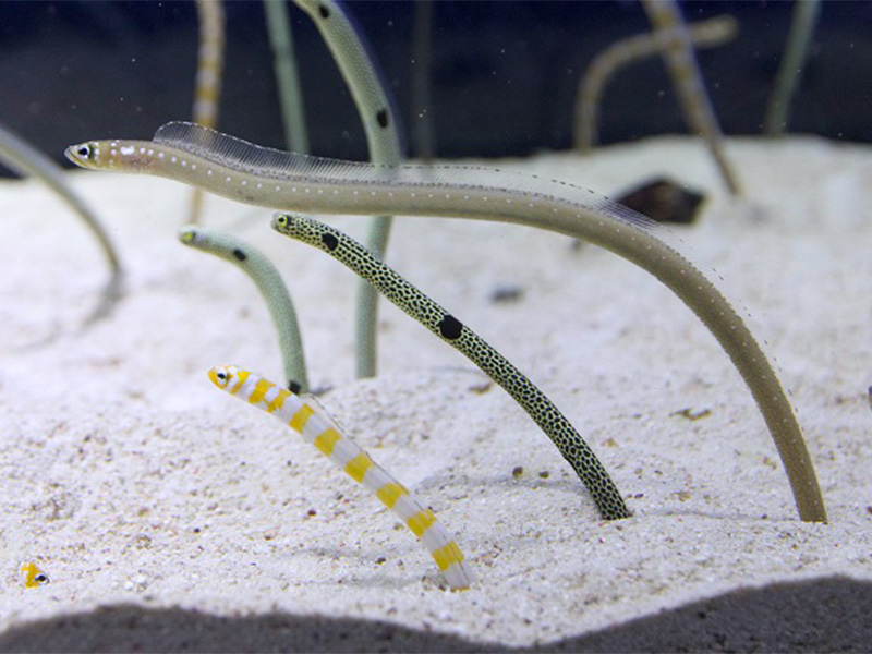 体の下部は常時砂に入っており、敵が近づくと全身を穴にひっこめて隠れる。「チンアナゴ」という名前が広く知られているが、左の写真だとチンアナゴは真ん中の個体。下はニシキアナゴ、上はホワイトスポッテッドガーデンイール。